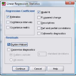 Lakukan regresi untuk data permintaan ayam di atas seperti pada Uji Normalitas. Setelah itu pilih  Statistics akan muncul tampilan seperti di bawah ini. Kemudian centang pilihan Durbin-Watson setelah itu pilih tombol Continue, pada tampilan selanjutnya pilih OK.