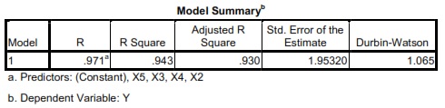 Hasil dari perhitungan Durbin-Watson Statistik akan muncul pada tabel Model Summary seperti di bawah ini: