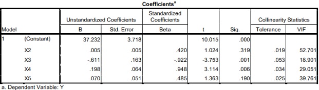 Dari tabel diatas dapat kita simpulkan bahwa seluruh variabel penjelas memiliki nilai VIF lebih besar 10 maka dapat disimpulkan bahwa model regresi ini memiliki masalah Multikolinieritas.