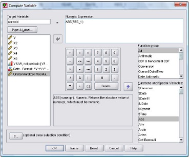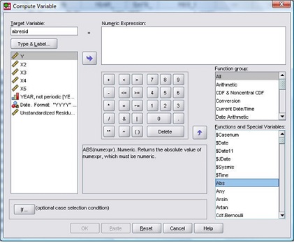 Pada kotak  Target Variable ketik abresid, pada kotak Function group pilih All dan dibawahnya akan muncul beberapa pilihan fungsi. Pilihlah Abs.