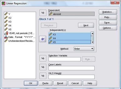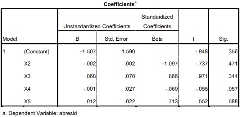 Selanjutnya masukkan variabel abresid pada kotak sebelah kiri ke kotak Dependent, dan variabel X2, X3, X4 dan X5 ke kotak Independent(s) dengan mengklik tombol tanda panah dan OK, hasilnya sebagai berikut: