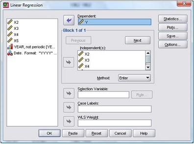 Selanjutnya inputkan variabel Y pada kotak sebelah kiri ke kotak Dependent, dan variabel X2, X3, X4 dan X5 ke kotak Independent(s) dengan mengklik tombol tanda panah. Kemudian pilih Save dan muncul tampilan sebagai berikut: