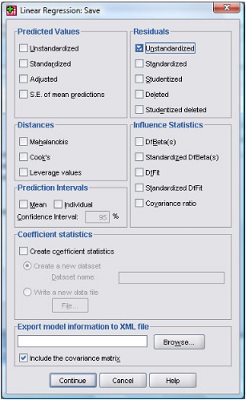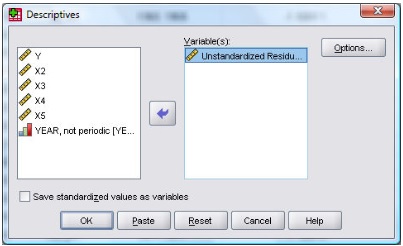 Centang pilihan Unstandardized pada bagian Residuals, kemudian pilih Continue dan pada tampilan awal pilih tombol OK, akan menghasilkan variabel baru bernama Unstandardized Residual (RES_1). Selanjutnya Analyze -> Descriptive  Statistics -> Descriptives akan muncul tampilan sebagai berikut: