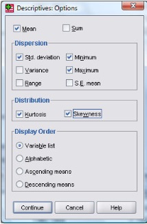 Centang pilihan  Kurtosis dan Skewness dan kemudian Continue dan pada tampilan awal pilih OK. Hasilnya sebagai berikut :