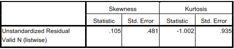 Terlihat bahwa rasio skewness =  0,105/ 0,481 = 0,218; sedang rasio kurtosis = -1,002/ 0,935 = -1,071. Karena  rasio  skewness  dan  rasio  kurtosis  berada  di  antara  –2  hingga  +2, maka  dapat disimpulkan bahwa distribusi data adalah normal.