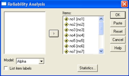 - Pada Reliability Analysis, masukkan “no1, no2 sampai no10” ke dalam kolom Items dengan cara blok semua nama kemudian klik anak panah ke kanan seperti gambar dibawah ini.