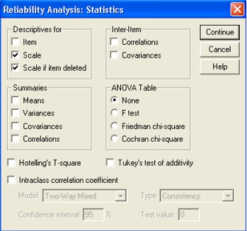 - Setelah semua nama masuk ke kolom Items, klik menu Statistics. Pada menu Descriptives for, centang Scale dan Scale if item deleted seperti gambar dibawah.