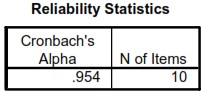 Pada bagian Reliability Statistics terlihat nilai Cronbach’s Alpha = 0.954 yang lebih besar dari r tabel (0.632) dengan taraf signifikansi 5%. Hal ini berarti kuisioner terbukti reliabel.