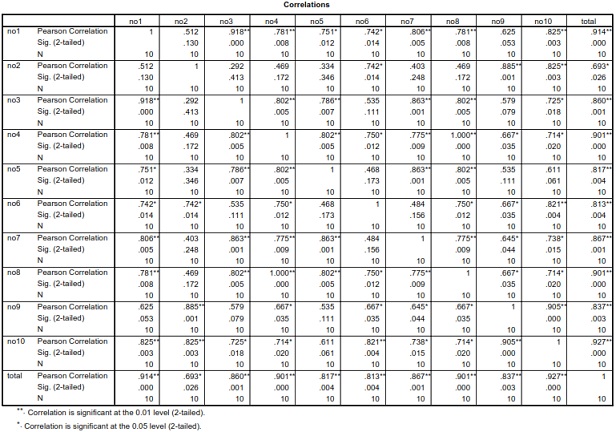 Hanya jika nilai sig. (2-tailed) lebih kecil dari 0,05 dan Pearson Correlation memiliki nilai positif, barulah instrumen pengukuran dikatakan valid. Di luar hasil ini, maka tidak valid.